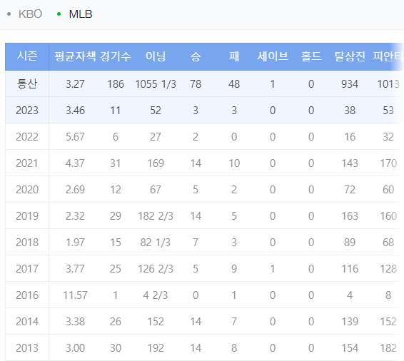 메이저리그에서도 제대로 던진 시즌 중 4점대 이상의 ERA를 기록한 것은 2021년(4.37) 뿐이었다.